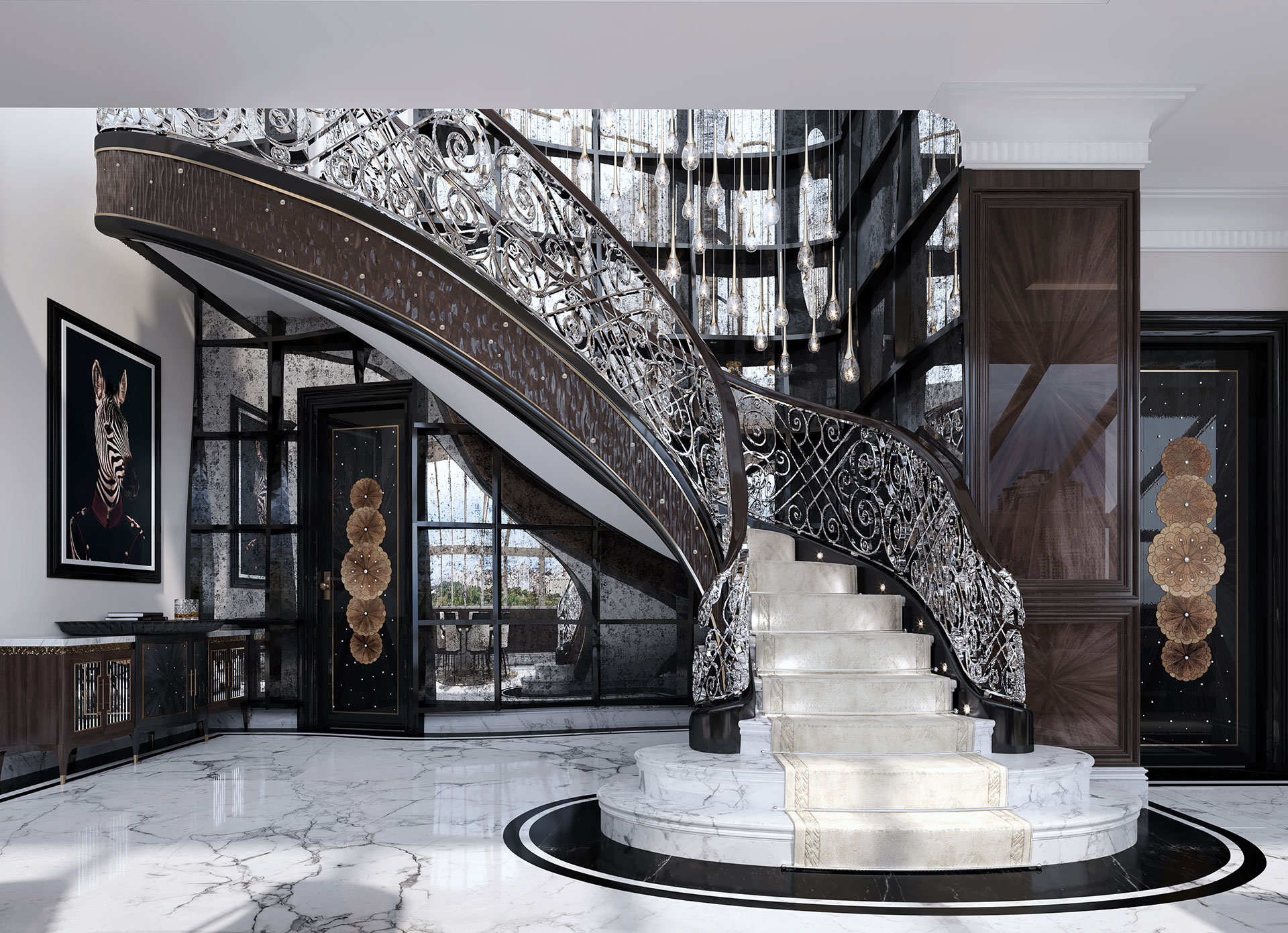 Designed with a bold contrast of colors, textures, and materials, the entrance to the Plaza penthouse sets the tone for the rest of the
